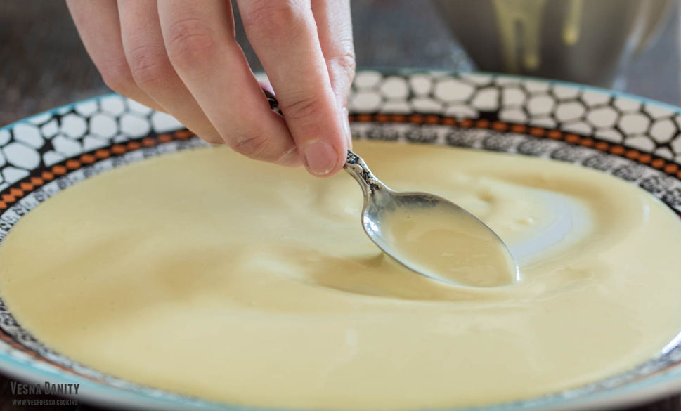 Am adăugat câte o linguriță de ulei de măsline, amestecând încontinuu până ce am rămas cu o singură lingură de ulei.
